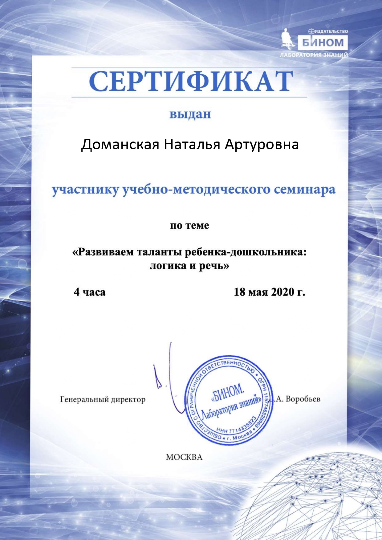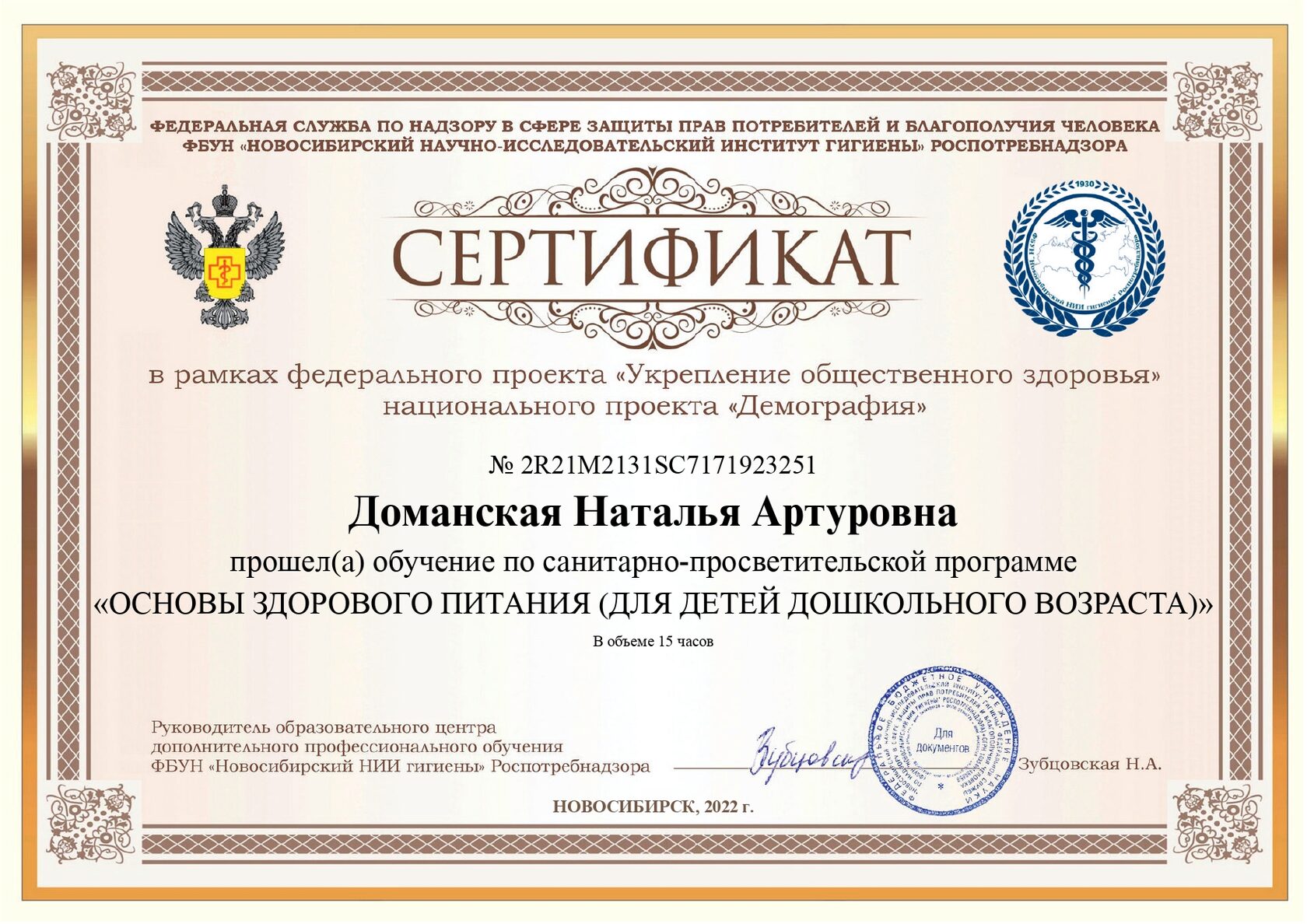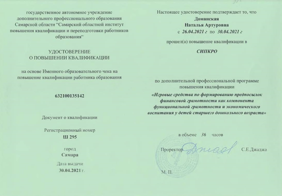 1. Издательство «Бином. Лаборатория знаний» «Почему дети любят наблюдать и экспериментировать? или Разностороннее развитие детей средствами науки» 4 ч. 17.04.2020 2. Издательство «Бином. Лаборатория знаний» «Сидим дома весело и с пользой: о любви к математике и не только» 4 ч. 12.05.2020 3. Издательство «Бином. Лаборатория знаний» «ТРИЗ подход. Инструменты для работы с информацией» и самостоятельного обучения» 4 ч. 13.05.2020 4. Издательство «Бином. Лаборатория знаний» «Развиваем таланты ребенка-дошкольника: логика и речь» 4 ч. 18.05.2020 5. Государственное автономное учреждение дополнительного профессионального образования Самарской области «Самарский областной институт повышения квалификации и переподготовке работников образования» «Проектирование деятельности современного педагога с использованием цифровых технологий и сервисов сети Интернет» 36 ч. 23.04.2021г. 6. Государственное автономное учреждение дополнительного профессионального образования Самарской области «Самарский областной институт повышения квалификации и переподготовке работников образования» «Игровые средства по формированию предпосылок финансовой грамотности как компонента функциональной грамотности и экономического воспитания у детей старшего дошкольного возраста» 36 ч. 30.04.2021г. 7. Государственное автономное учреждение дополнительного профессионального образования Самарской области «Самарский областной институт повышения квалификации и переподготовке работников образования» «Обеспечение реализации Стратегии национального проекта «Развитие образования» на региональном уровне (в сфере дошкольного образования)» 18 ч. 18.05.2021г. 8. Институт ЮНЕСКО по информационным технологиям в образовании «Цифровые инструменты и сервисы для учителя» 29.11.2021г. 9. Stepik - образовательная платформа и конструктор онлайн-курсов. «Как учиться эффективно - Полина Кривых x I Love Economics» 30.03.2022г. 10. ФЕДЕРАЛЬНАЯ СЛУЖБА ПО НАДЗОРУ В СФЕРЕ ЗАЩИТЫ ПРАВ ПОТРЕБИТЕЛЕЙ И БЛАГОПОЛУЧИЯ ЧЕЛОВЕКА ФБУН «НОВОСИБИРСКИЙ НАУЧНО - ИССЛЕДОВАТЕЛЬСКИЙ ИНСТИТУТ ГИГИЕНЫ» РОСПОТРЕБНАДЗОРА Федеральный проект «Укрепление общественного здоровья» Программа «Основы здорового питания (для детей дошкольного возраста) 15 ч. 07.05.2022г. 11. ФЕДЕРАЦИЯ РАЗВИТИЯ ОБРАЗОВАНИЯ ОБРАЗОВАТЕЛЬНАЯ ПЛАТФОРМА «КАФЕДРА ПЕДАГОГИКИ РФ» ООО «Межреспубликанский институт повышения квалификации и переподготовки кадров при Президиуме ФРО» по программе дополнительного образования «Дошкольное образование и специфика реализации программ дошкольного образования во взаимосвязи с обновленными ФГОС – 21 начального и общего образования. Новые цифровые платформы Минпросвещения РФ» 144 ч. 05.09.2022г.