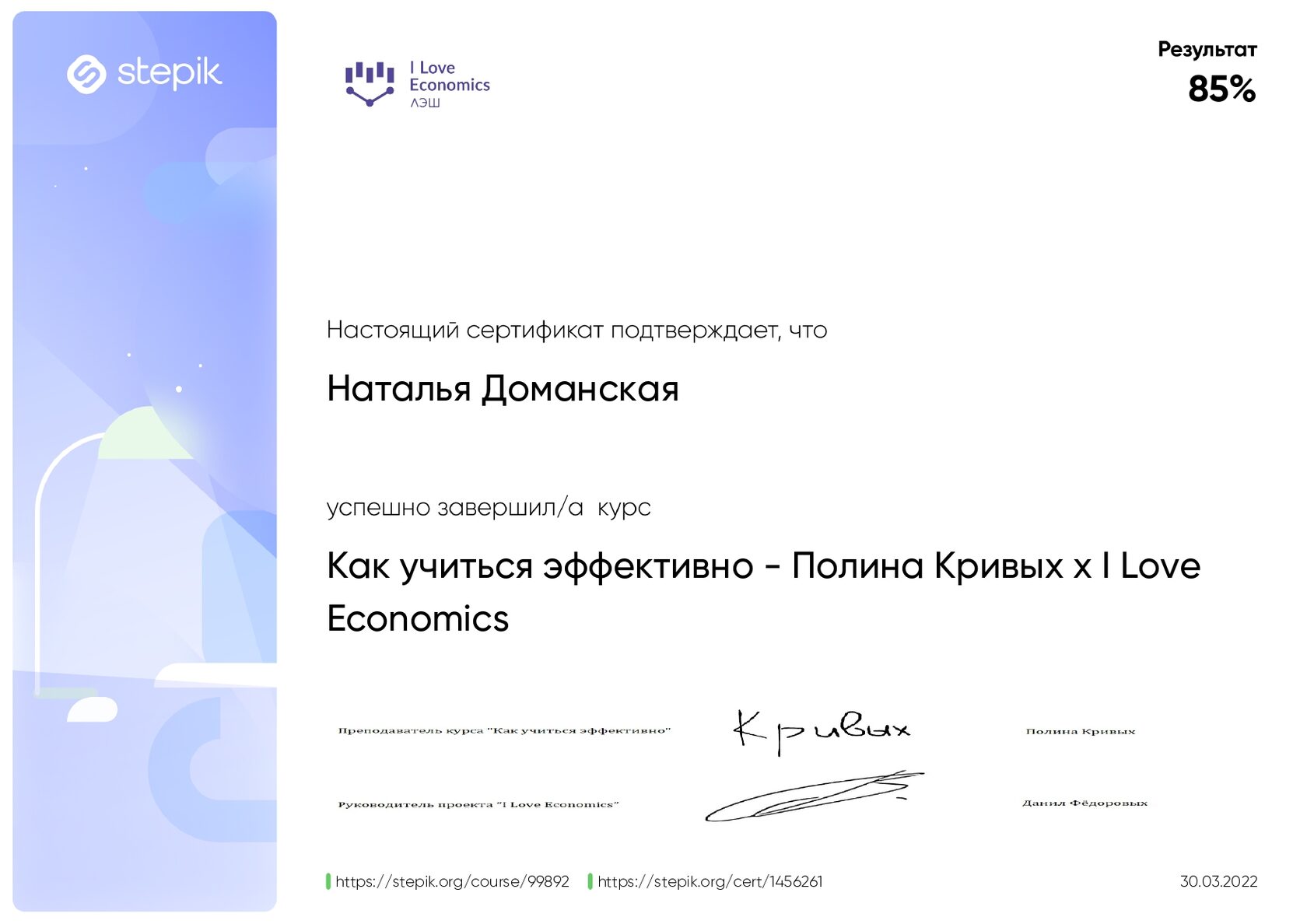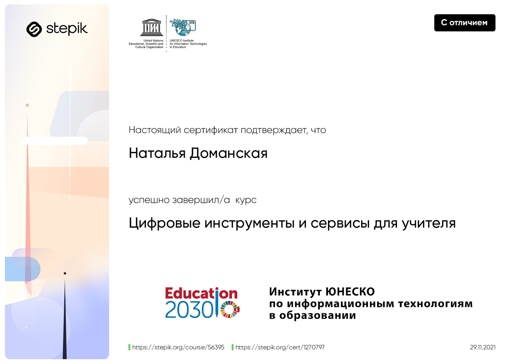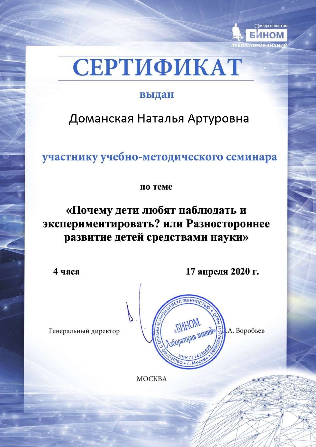 1. Издательство «Бином. Лаборатория знаний» «Почему дети любят наблюдать и экспериментировать? или Разностороннее развитие детей средствами науки» 4 ч. 17.04.2020 2. Издательство «Бином. Лаборатория знаний» «Сидим дома весело и с пользой: о любви к математике и не только» 4 ч. 12.05.2020 3. Издательство «Бином. Лаборатория знаний» «ТРИЗ подход. Инструменты для работы с информацией» и самостоятельного обучения» 4 ч. 13.05.2020 4. Издательство «Бином. Лаборатория знаний» «Развиваем таланты ребенка-дошкольника: логика и речь» 4 ч. 18.05.2020 5. Государственное автономное учреждение дополнительного профессионального образования Самарской области «Самарский областной институт повышения квалификации и переподготовке работников образования» «Проектирование деятельности современного педагога с использованием цифровых технологий и сервисов сети Интернет» 36 ч. 23.04.2021г. 6. Государственное автономное учреждение дополнительного профессионального образования Самарской области «Самарский областной институт повышения квалификации и переподготовке работников образования» «Игровые средства по формированию предпосылок финансовой грамотности как компонента функциональной грамотности и экономического воспитания у детей старшего дошкольного возраста» 36 ч. 30.04.2021г. 7. Государственное автономное учреждение дополнительного профессионального образования Самарской области «Самарский областной институт повышения квалификации и переподготовке работников образования» «Обеспечение реализации Стратегии национального проекта «Развитие образования» на региональном уровне (в сфере дошкольного образования)» 18 ч. 18.05.2021г. 8. Институт ЮНЕСКО по информационным технологиям в образовании «Цифровые инструменты и сервисы для учителя» 29.11.2021г. 9. Stepik - образовательная платформа и конструктор онлайн-курсов. «Как учиться эффективно - Полина Кривых x I Love Economics» 30.03.2022г. 10. ФЕДЕРАЛЬНАЯ СЛУЖБА ПО НАДЗОРУ В СФЕРЕ ЗАЩИТЫ ПРАВ ПОТРЕБИТЕЛЕЙ И БЛАГОПОЛУЧИЯ ЧЕЛОВЕКА ФБУН «НОВОСИБИРСКИЙ НАУЧНО - ИССЛЕДОВАТЕЛЬСКИЙ ИНСТИТУТ ГИГИЕНЫ» РОСПОТРЕБНАДЗОРА Федеральный проект «Укрепление общественного здоровья» Программа «Основы здорового питания (для детей дошкольного возраста) 15 ч. 07.05.2022г. 11. ФЕДЕРАЦИЯ РАЗВИТИЯ ОБРАЗОВАНИЯ ОБРАЗОВАТЕЛЬНАЯ ПЛАТФОРМА «КАФЕДРА ПЕДАГОГИКИ РФ» ООО «Межреспубликанский институт повышения квалификации и переподготовки кадров при Президиуме ФРО» по программе дополнительного образования «Дошкольное образование и специфика реализации программ дошкольного образования во взаимосвязи с обновленными ФГОС – 21 начального и общего образования. Новые цифровые платформы Минпросвещения РФ» 144 ч. 05.09.2022г.
